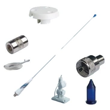 Stabantenne aus weißem Glasfiber für Motorboote zur lötfreien Kabelmontage. Lieferumfang komplett mit 4-Wege-Kippfuß aus Nylon, Schraubadapter auf 1 Zoll Gewinde und 4,5m Kabel RG-58