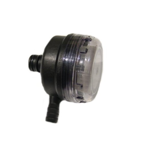 Robuster Wasserfilter mit einerseits Schlauchanschluß 1/2 Zoll und andererseits Quick-snap Fitting für Druckwasserpumpe.