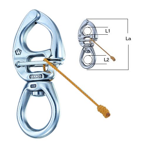 Hochwertiger Regatta-Schnappschäkel von Wichard - entworfen und hergestellt in Frankreich. Unentbehrlich für Spi- und Genuaschoten und auch für jede andere Anwendung bei der ein Loswerfen unter Last nötig ist wie z.B. schleppen und heben. Panikzugrichtung am Sicherheitsband entgegen der Lastzugrichtung und damit ein echter Panikschäkel.