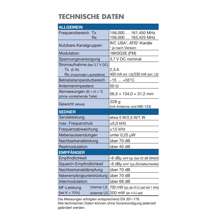 - Binnenschiffahrtsfunk (ATIS) möglich - ATIS-Code muss durch Händler programmiert werden
