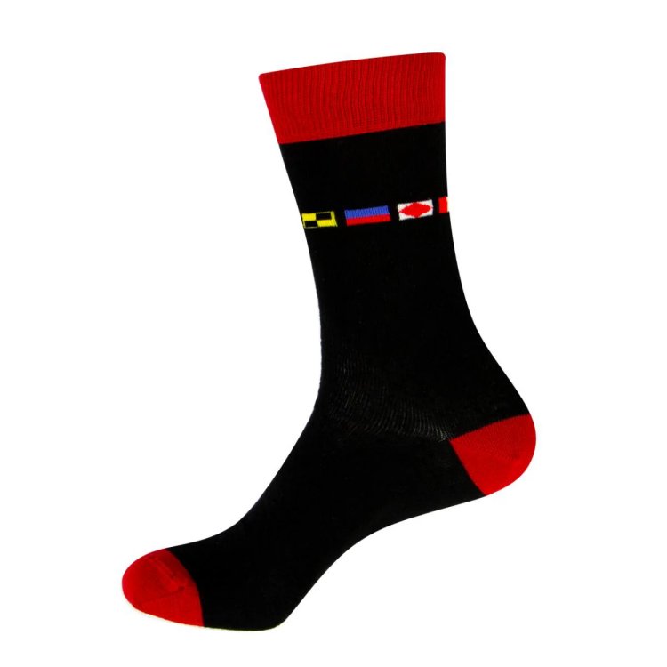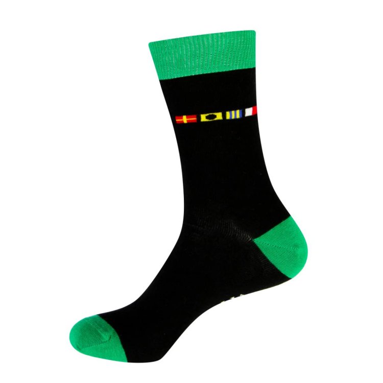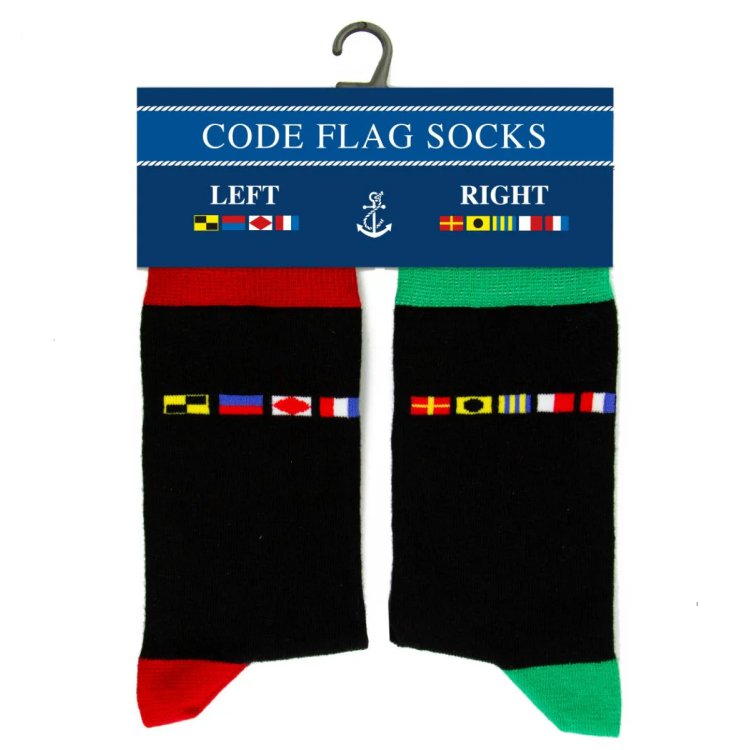 1 Paar witzige Seemannsocken mit dem jeweiligen Flaggencode für Links (Backbord) und Rechts (Steuerbord). Zehenspitze, Ferse und Bündchen sind jeweils in der entsprechenden Farbe rot für Backbord bzw. grün für Steuerbord gefärbt.