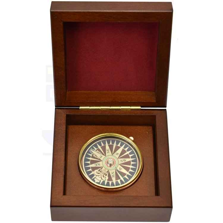 Einfach gelagerter Kompaß mit dekorativer Rose in hochwertigem Holzkästchen.