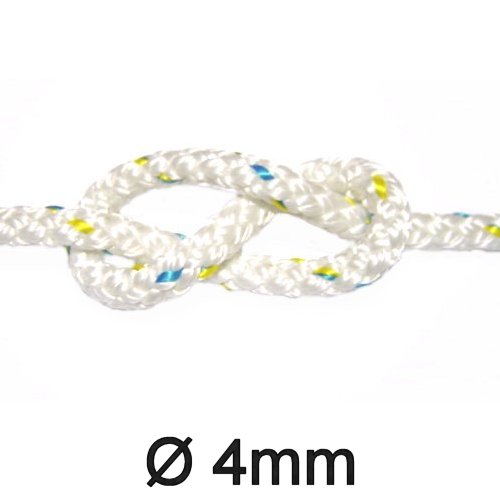 Vorgereckte dehnungsarme Leine aus geflochtenem Markenpolyester, weiß mit blau-goldenem Garantiefaden, geeignet als Vorläufer für Drahtfallen, Streckerleinen und Trimmleinen, ideal als Flaggleine.
