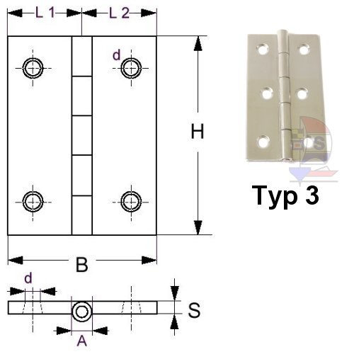 Scharnier Edelstahl 40x75 / 6L Typ 3